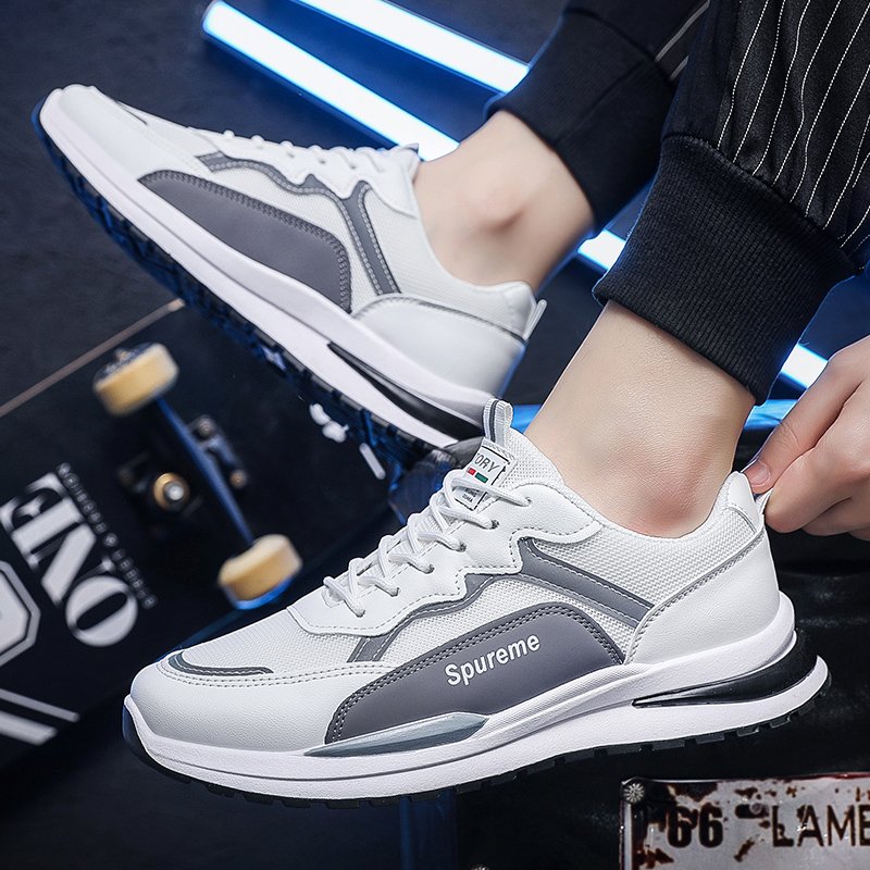These gray and white sneakers perfectly combine classic color tones with modern design, offering a sleek yet trendy style. The upper is crafted from high-quality mesh and synthetic leather, ensuring breathability and durability, making it ideal for daily commutes or casual wear. The lightweight sole provides excellent cushioning and traction, delivering a comfortable walking experience.