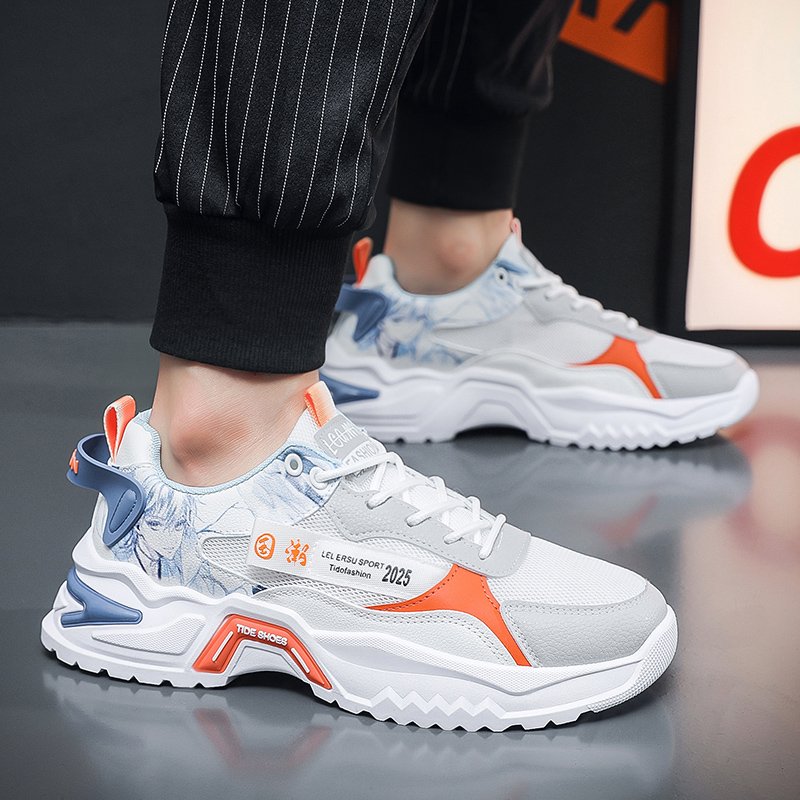 These trendy sports shoes combine style and functionality, designed for consumers who seek individuality and comfort. The upper is made of breathable mesh material, ensuring lightweight comfort, paired with bold graffiti patterns that showcase a unique streetwear style. The thick, anti-slip outsole offers excellent traction and stability, allowing you to move freely during daily wear or outdoor activities. The stylish color-blocking design and intricate detailing add a striking visual impact, making this a must-have fashion item for 2025. Whether for casual outings or fitness activities, these shoes meet your versatile needs and keep you effortlessly ahead of the fashion curve.