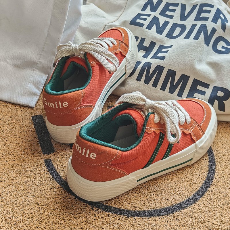 These retro-style casual shoes feature a vibrant orange base accented with classic green stripes, showcasing a unique blend of fashion and streetwear appeal. Crafted from premium canvas material, they are breathable, durable, and comfortable for all-day wear. The sturdy, anti-slip rubber sole ensures excellent grip and wear resistance, while the soft insole and lightweight design provide lasting comfort. Perfect for daily outings, campus life, or street fashion, these sneakers effortlessly complement any outfit, making them a must-have addition to your wardrobe.