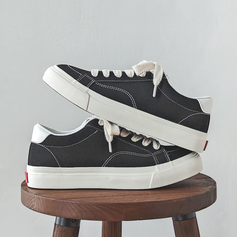 These classic black and white low-top sneakers feature a black suede upper and a white rubber sole, delivering a timeless and versatile design. The fine stitching and smooth lines add a touch of premium quality. The soft, breathable upper ensures comfort for extended wear, while the durable, anti-slip rubber sole provides excellent grip, making it perfect for daily commutes, casual outings, and various occasions.