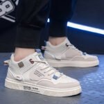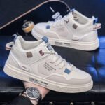 These modern high-top sneakers feature a sleek beige colorway with subtle blue and grey accents, combining style and functionality for the ultimate urban look. The premium synthetic leather upper ensures durability and easy maintenance, while the intricate stitched details and graphic design elements add a bold, contemporary vibe. The soft, cushioned interior provides excellent comfort for long-lasting wear, and the anti-slip rubber outsole offers exceptional traction and stability on all surfaces. Perfect for fashion-forward individuals who value comfort and design.