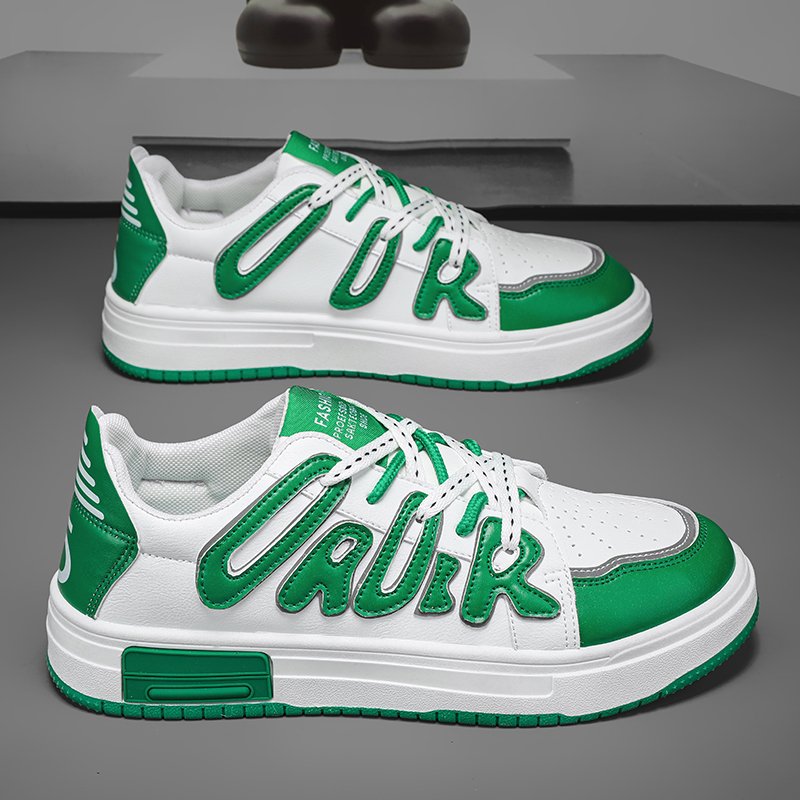 This pair of green and white spliced casual sneakers is designed with bold street style, making you the center of attention. The upper combines premium leather and breathable mesh, ensuring both fashion and comfort for an exceptional wearing experience. The unique 3D letter embellishments highlight a trendy and personalized look. The anti-slip and wear-resistant rubber outsole provides excellent traction and ensures safe and stable walking. The lightweight and comfortable insole offers lasting support for your daily activities. Whether for casual wear or sporty outings, these stylish sneakers are the perfect choice to help you effortlessly step into the spotlight!